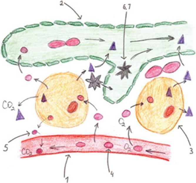 По артериальным капиллярам доставляется не только кислород и вода в межклеточное пространство, но и все необходимые питательные и строительные вещества для клеток нашего организма (глюкоза, аминокислоты). Питательные вещества попадают в клетки. В них происходят различные процессы обмена, построения новых компонентов и т. д., то есть идет переработка питательных веществ. Потом продукты обмена (то есть те вещества, которые клетке уже не нужны, и те, которые она сама синтезировала) попадают обратно в межклеточное пространство. Это уже другие вещества, которые могут быть такого же размера, а могут быть больше, в зависимости от того, какие вещества производит данный тип клеток.