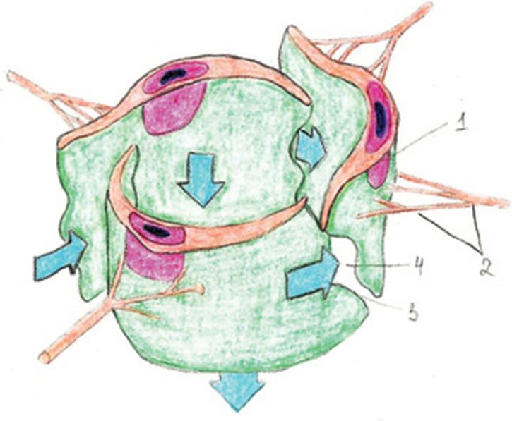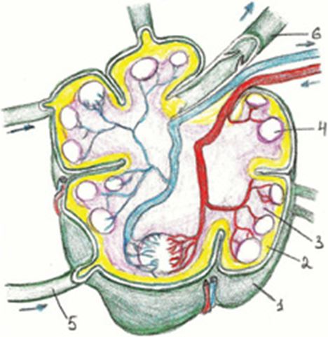 Содержимое лимфатического сосуда, состоящее из перечисленных выше компонентов, называется лимфа. Лимфа двигается по лимфатическим сосудам и через какое-то время на своем пути встречает лимфатический узел. (Рис. 6)