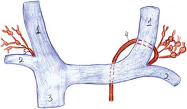Рис. 7. Правый и левый венозный угол. 1 – внутренние яремные вены, 2 – подключичные вены, 3 – верхняя полая вена, 4 – грудной проток, 5 – правый лимфатический проток