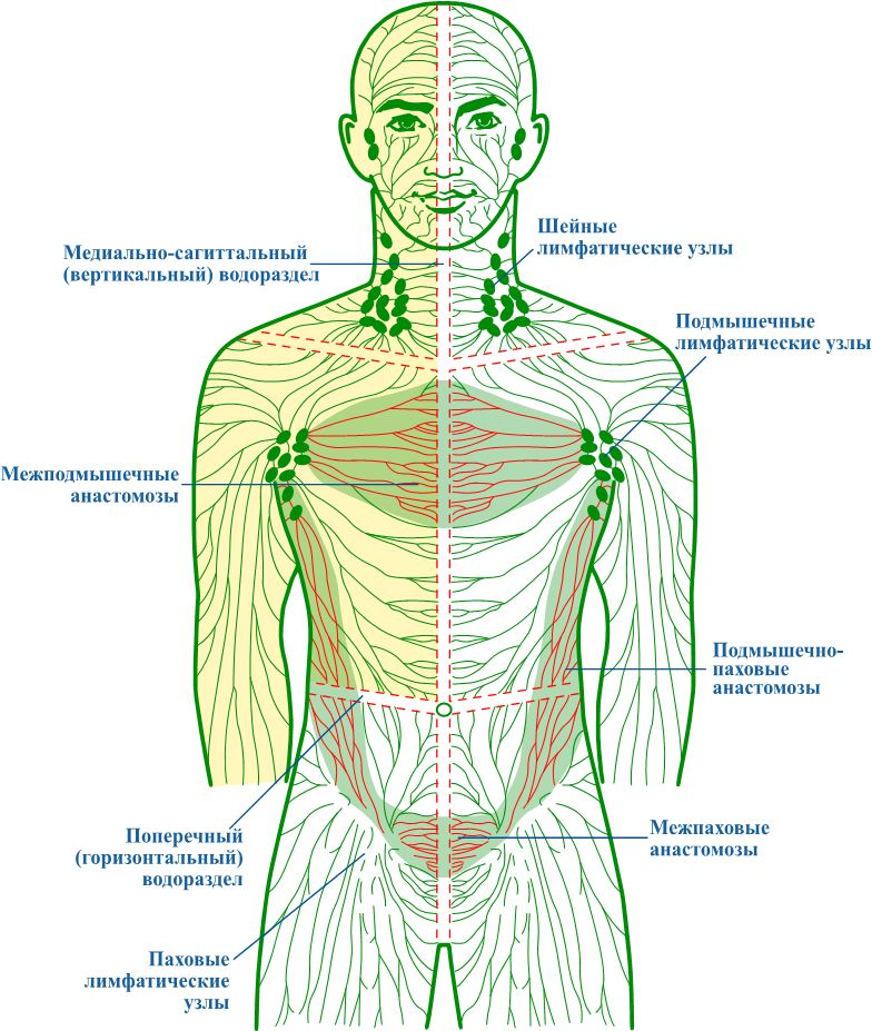 Рис. 9. Поверхностные лимфатические сосуды и узлы. Вид спереди