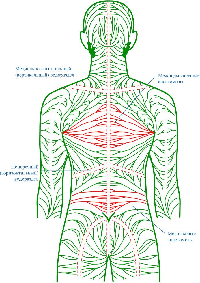 Рис. 9. Поверхностные лимфатические сосуды и узлы. Вид сзади