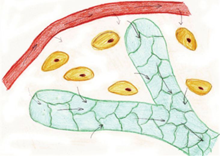 Когда объем межклеточного пространства увеличивается, «тросики» натягиваются и клетки лимфатического сосуда немного расходятся. Образуются щели, в которые могут попасть уже крупные белки, оставшиеся 10 % жидкости, а также вирусы, бактерии, грибы, мертвые и опухолевые клетки. То есть в лимфатический капилляр собирается все, что невозможно вывести из межклеточного пространства с помощью кровеносных сосудов. (Рис. 5)