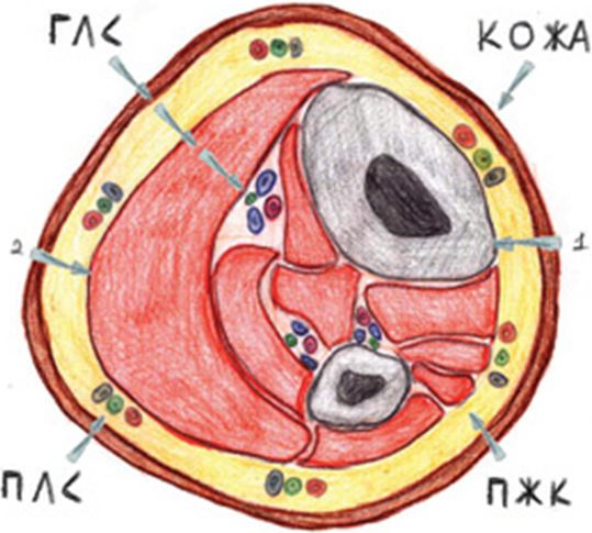 Рис. 14. 1 – кость, 2 – мышцы, ПЛС – поверхностный лимфатический сосуд, ГЛС – глубокий лимфатический сосуд
