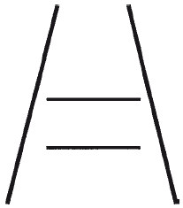 Наиболее известным из рисунков такого рода являются стрелы Мюллер-Лайера, изображенные на рис. 1.10. Это просто пара стрел, древки которых одинаковой длины, но одна стрела имеет наконечники с расходящимися, а другая – со сходящимися к древку концами. Стрела с расходящимися наконечниками кажется длиннее, хотя фактически обе стрелы одинаковой длины. Мы будем называть этот рисунок просто иллюзией стрелы. Второй пример также хорошо известен, и специалисты называют его фигурой Понцо. Он состоит всего из четырех линий: двух одной и той же длины, идущих рядом, но не сходящихся, и между ними двух других, равных по длине и параллельных (см. рис. 1.11). Одна из линий, расположенная в узкой части пространства, заключенного между двумя сходящимися линиями, кажется длиннее, хотя фактически обе параллельные линии одинаковой длины. Мы будем называть этот рисунок иллюзией железнодорожных путей.