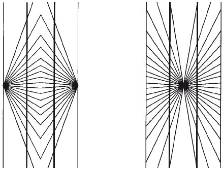 Рис. 1.12. Рисунок Геринга, или иллюзия веера. Расходящиеся в виде лучей линии изгибают наложенные на них прямые. (Это пример иллюзии, где одна часть рисунка влияет на другую, в то время как стрелы Мюллер-Лаейра неверно воспринимаются сами по себе.)