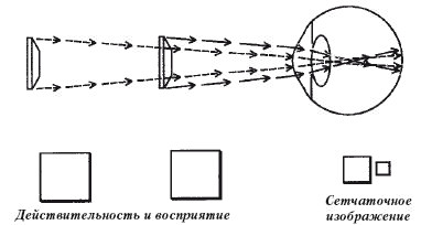 Рис. 1.16. Константность величины. Изображение объекта на сетчатке уменьшенного по величине наполовину с увеличенным расстоянием до этого объекта вдвое. Но он не кажется нам так сильно уменьшенным. Мозг компенсирует сокращение изображения при увеличении расстояния посредством механизма, который мы называем шкалирующим механизмом константности. (Именно здесь-то и кроется секрет искажающих иллюзий.)