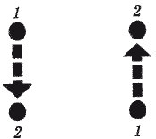 Рис. 1.23. Точки под номером 1 зажигаются одновременно; спустя секунду одновременно зажигаются точки 2. Наблюдатель одновременно видит справа движение точки вверх, а слева – движение точки вниз