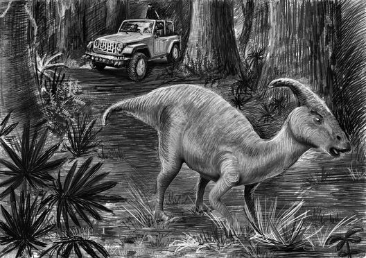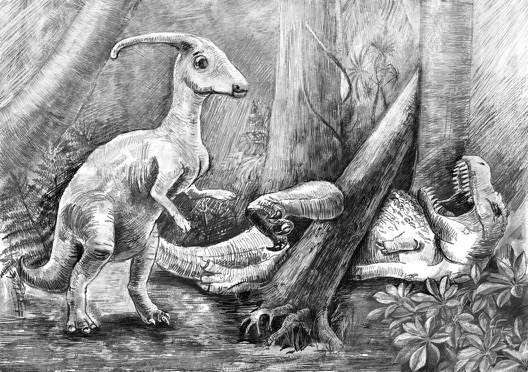 Внезапно где-то недалеко хрустнула ветка… Как по команде все динозаврики на полянке замерли и вытянули шеи, пытаясь поймать хоть еще какой-то звук, который мог подтвердить худшие опасения или успокоить волнения травоядных динозавров. Если бы у динозавров были уши как у оленей – они бы их, как говорят, навострили. Несколько секунд ничего не происходило. Совсем ничего – паразауролофы не шевелились, ветки не трещали – все замерло в предвкушении чего-то важного. И важное не заставило себя ждать – деревья заскрипели, послышался уже вполне серьезный хруст, и в тот же миг у маленьких динозавров не осталось сомнений – надо бежать! Бежать! Не оглядываясь! Только так можно спасти-и-и-сь…