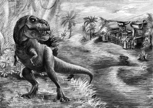 В середине полянки стояло некое сооружение, которое мозг динозавра вообще ни с чем бы не смог сравнить, но вы бы, уважаемые мои читатели, сразу бы догадались, что перед вами что-то вроде крепости с башнями, у которой вместо стен были решётки, а в самой высокой башне, которая выглядела как диспетчерская башня аэропорта из-за наблюдательной будки в верхней ее части – так вот в этой башне были встроены подъемные ворота в виде еще одной мощной решётки. На других башнях были размещены вертолетная площадка, пусковая установка с несколькими ракетами и, наконец, на последней был смонтирован подъемный кран. Под вертолетной площадкой находилась еще одна кабина непонятного предназначения. Но самым главным, что увидели все динозавры, было то, что в середине этой крепости – прямо на траве – лежал огромный кусок мяса и источал удивительные (для любого большого и маленького хищника) ароматы! Собственно, учитывая то, что динозавры никогда не видели крепостей и ничего о них ни от кого не слыхали, мозг и Заврии, и Ти-Рекса приковал именно кусок мяса. Однако Дин хищником не был и с любопытством продолжал рассматривать все зрелище в целом, вместе с крепостью, пытаясь осознать – что же это такое, зачем оно здесь и вообще, чего от него ждать.