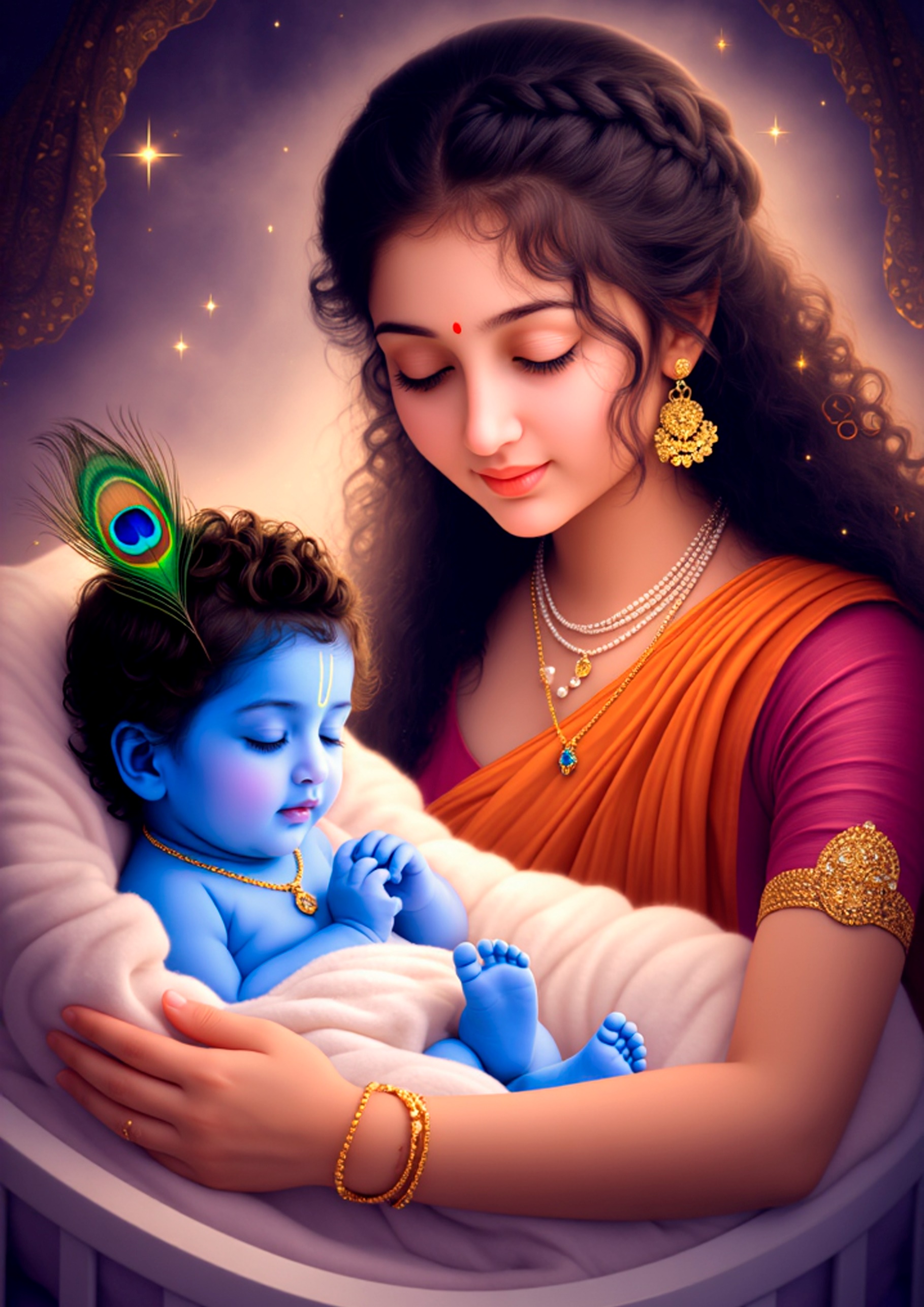 В уютной комнате, где воздух пахнул тёплым молоком и мёдом, маленький Кришна дремал в своей золотой колыбельке-облачке. Мама Яшода, сидя рядом, вышивала сияющий лунный узор.