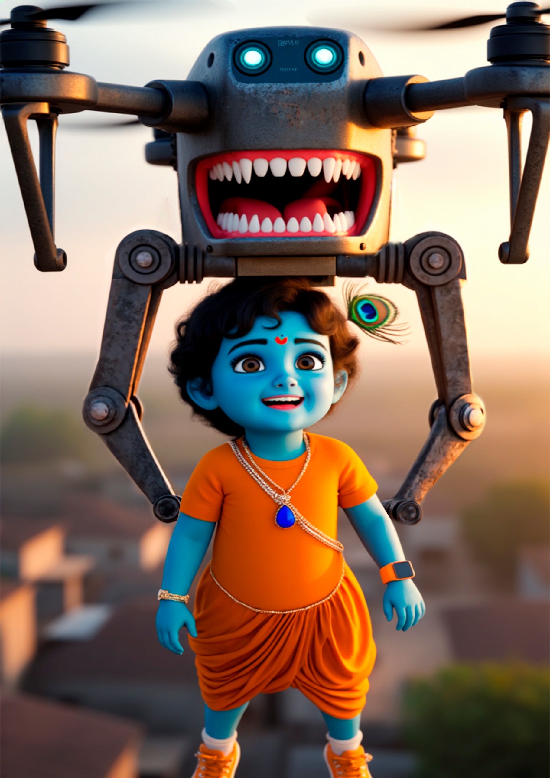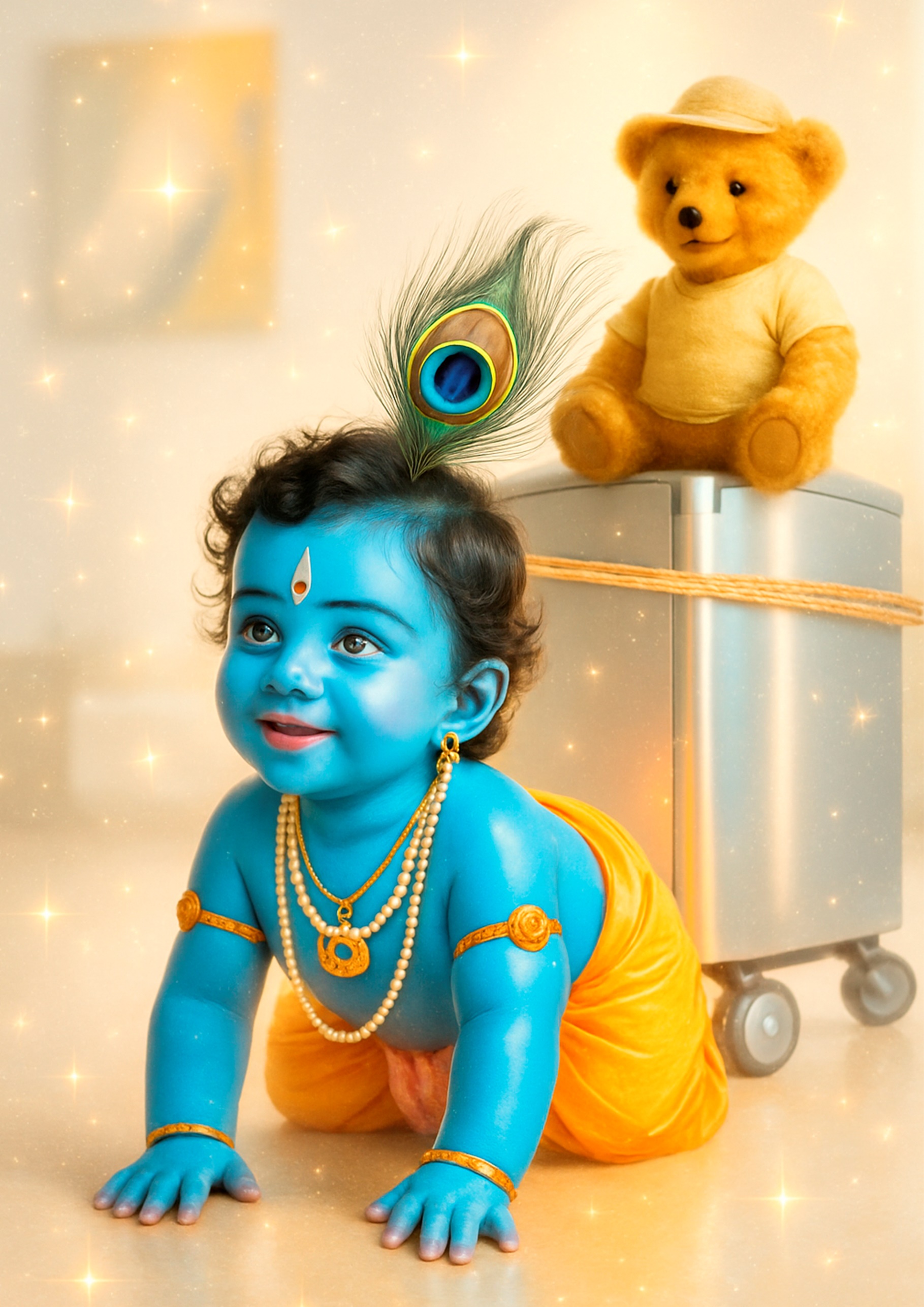 В уютном доме, где воздух пах корицей, ванилью и теплым хлебом, жил маленький Кришна. Его смешинки прыгали, как солнечные зайчики, а кудряшки вились, будто барашки из тучки. На столе стояла Мультиварка Варя. Она была блестящая, с веселыми огоньками-глазками. "Пшшш-буль!" – пела она, готовя супчики, и все улыбались.