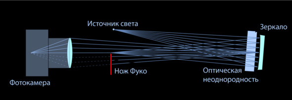С XVII в. был известен способ изготовления вогнутых зеркал для телескопов. Однако для хорошего качества картинки требовалось соблюдение крайней точности в шлифовке и полировке оптических поверхностей. Для мастеров тех времен создание оптики идеальной формы представляло труднейшую задачу. В 1857 г. физик Леон Фуко предложил оптический метод контроля точности изготовления вогнутых зеркал: в фокусе проверяемого зеркала помещался непрозрачный экран с острой кромкой (в дальнейшем названный «ножом Фуко»). Отраженное изображение источника света (точечного или щелевого) фокусировалось на самом краю ножа, и, если поверхность зеркала оказывалась строго сферической, нож перекрывал весь световой пучок, и для наблюдателя зеркало оказывалось полностью затемненным. Если же на поверхности были дефекты, часть света, отраженная неровными участками зеркала, отклонялась, проходя мимо кромки ножа, и для наблюдателя эти участки выглядели светлыми.