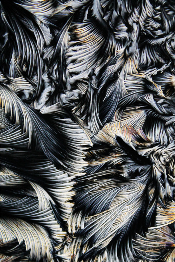 Интересные снимки получаются при фотографировании анизотропных кристаллов – на месте прозрачных, с трудом различимых обычным зрением структур появляются контрастные узоры, зачастую приобретающие окраску. Для того чтобы произвести подобную съемку, необходимо нанести на стекло тонкий слой кристаллического вещества. Можно смешать водный раствор оптически активной соли (например, сульфата меди) с растворенным в горячей воде желатином или гуммиарабиком, вылить на стекло получившуюся эмульсию и распределить ее по поверхности тонким слоем (именно так был получен изображенный на фото 2 снимок кристаллов медного купороса).