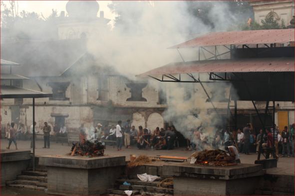 На противоположном берегу над ступенями возвышаются прямоугольные постаменты. Часть из них плотно сверху заложена большими дровинами, а другая часть занята горящими кострами. И в этот момент я внезапно осознаю, что в пламени, поверх пылающих бревен-дров, лежат тела! Это горят погребальные костры! Густой дым от них несет свой незнакомый аромат и привкус. На небольшом удалении от каждого постамента сидят люди. (У некоторых мужчин побриты головы, очевидно, как часть ритуала.) Зрелище завораживает!