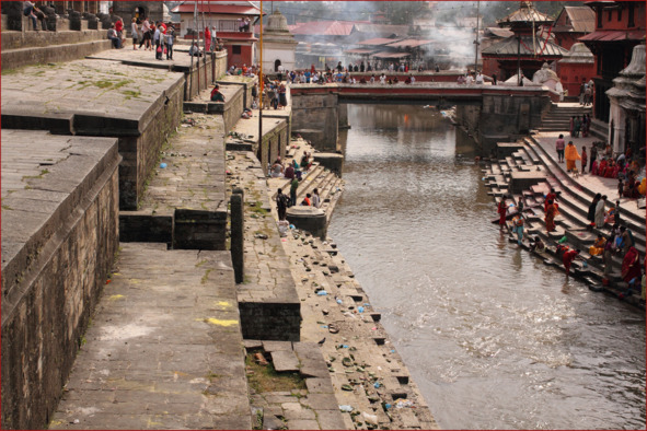 На той части берега, где я стою, много народу. Это и местные, и туристы. Их взоры обращены на ту сторону, с кострами. Наконец трогаюсь с места и иду мимо небольшого, но основательного моста, соединяющего берега реки. Он как бы приглашает пройти ближе к кострам. Но мне хочется исследовать еще эту сторону, а отсюда лучше видно, что происходит на той. За мостом, на другой стороне реки справа, еще постаменты. Они пусты и используются исключительно для кремации знати. Именно на них были преданы огню недавно трагически погибшие 1 июня 2001 г. члены королевской семьи.