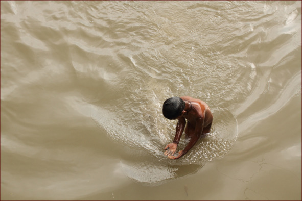 Здесь берег с обеих сторон уже одет в каменные плиты и как бы подпирает реку с двух сторон, заставляя ее течь стремительнее. Плиты строгими ступенями сходят в мутный поток реки. Камень прочен, но местами ступени разрушены. Эта атмосфера древности и запустения только еще больше усиливает мое восприятие индуизма как сосредоточенности на сакральном.