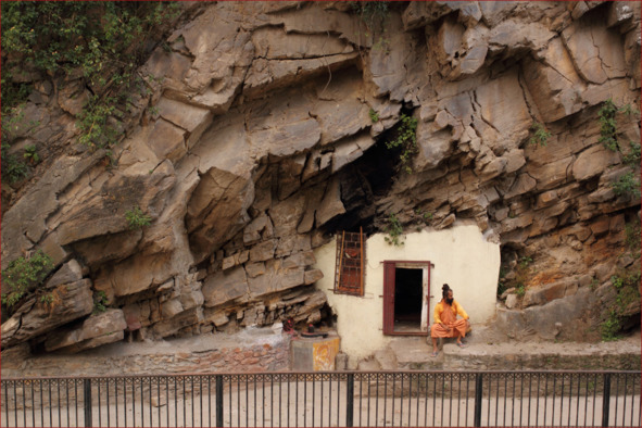 Дальше берег переходит в скальную стену с жилищами отшельников. Подобное жилище – это просто облагороженная постройкой ниша с вполне функциональной обычной дверью. Рядом сидит сам владелец жилища – отшельник. Я сфотографировал его издалека.