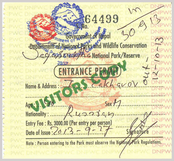 Доехали быстро. При моей любви к прогулкам по новым местам я без труда мог сюда быстро добраться самостоятельно и пешком (что я и сделал через две недели на обратном пути). Но сейчас я предпочитаю собрать информацию, доверяясь добровольным помощникам. Внутри Центра потенциальные треккеры тут и там заполняют необходимые анкеты-документы. Это же проделываю и я, еще не совсем понимая, что и куда подавать. Иду в одно место, в другое. В одном улыбающиеся молодые женщины принимают анкету и фотографию, в другом пожилой мужчина безэмоционально берет оплату. В моих руках небольшой нарядный номерной квиток желтого цвета с мелкими печатями – Entrance permit8 за 3000 рупий (30 долларов в моем случае).