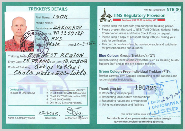 Теперь у меня есть разрешение на посещение Национального парка Сагарматха (Sagarmatha National Park) – территории, где проходит большая часть треккинга. И книжка с корочкой в темно-зеленых и голубых тонах – Registration Card for Individual Trekkers9 – карточка треккера за 2000 рупий (20 долларов), в просторечии для краткости TIMS (Trekker`s Information Management System).