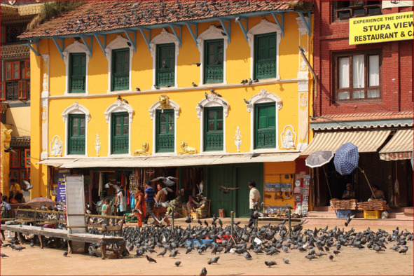 Огромное сооружение зажато плотным кругом из разноцветных трехэтажных домиков. Вроде как все это тибетские монастыри. И я – в самом центре тибетского буддизма в Непале!