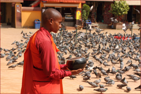 Мое внимание привлекает монах в оранжево-бордовых одеяниях, который смиренно-неподвижно стоит среди сотен голубей и ждет подаяний. Снимаю и его.