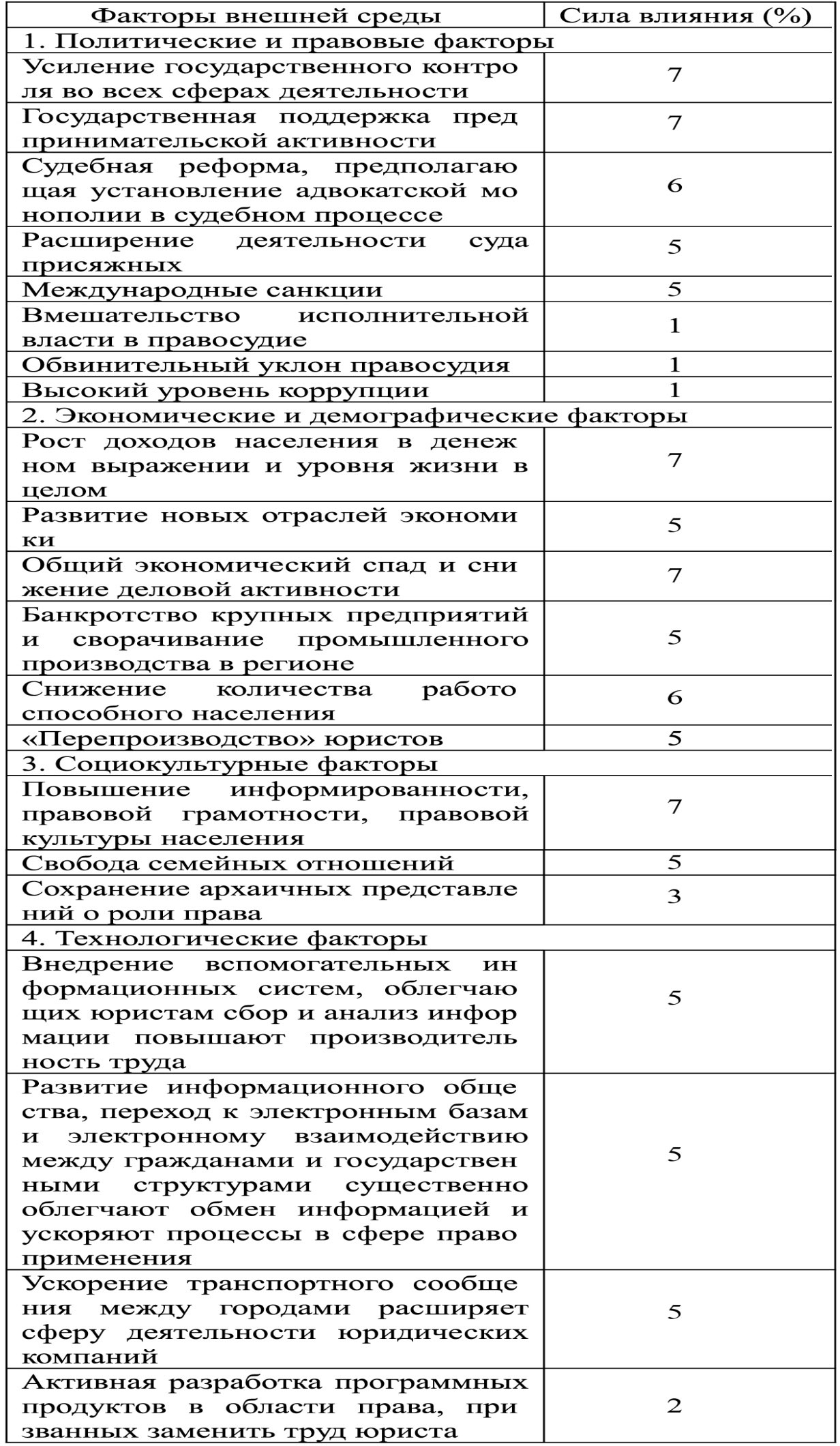 Таблица № 1. Наиболее значимые факторы внешней среды для адвокатского бюро