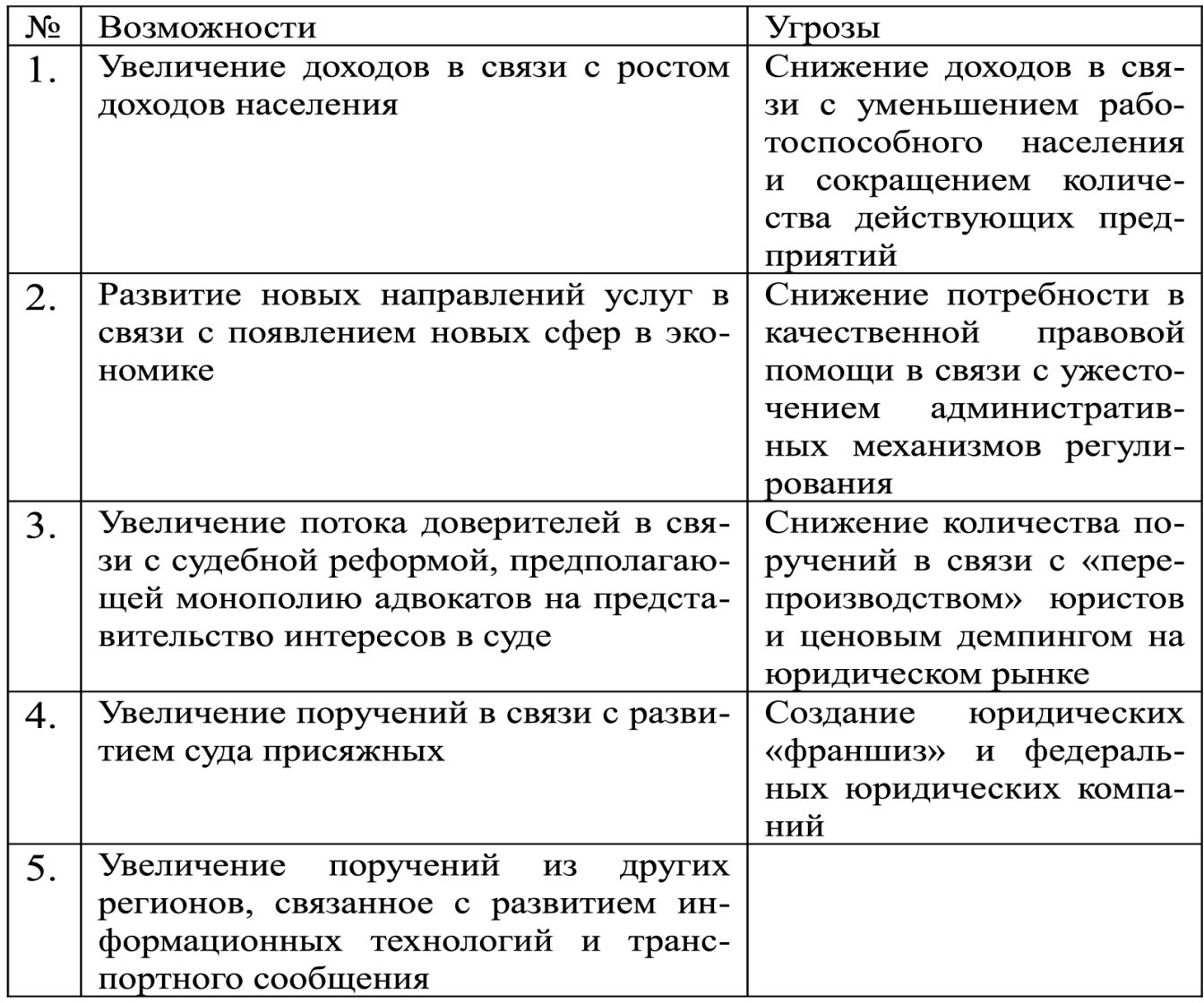 Таблица № 3. Возможности и угрозы для адвокатского бюро