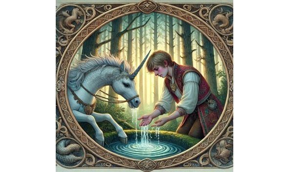 Дал князь второе задание: поймать и приручить дикого Единорога, который повадился по ночам поле их топтать и пшеницу есть. Не столько съест, сколько потопчет. Взял Светозар уздечку и пошёл в поле. Видит – идёт к нему Ладушка и несёт кувшин с водой. Протянула юноше кувшин и говорит: