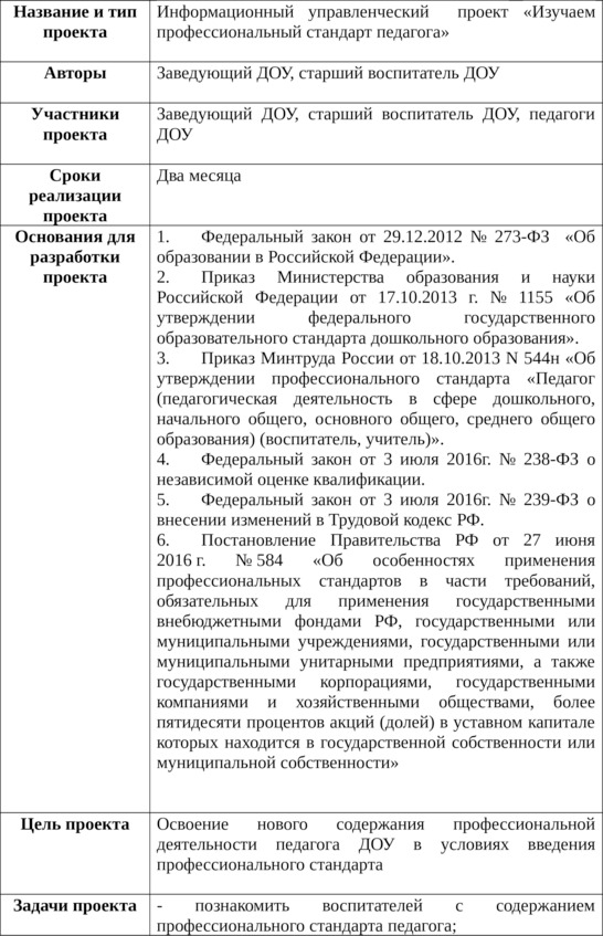Актуальность данного проекта обусловлена изданием Приказа Минтруда России от 18.10.2013 N 544н «Об утверждении профессионального стандарта «Педагог (педагогическая деятельность в сфере дошкольного, начального общего, основного общего, среднего общего образования) (воспитатель, учитель)» и необходимостью освоения содержания профессионального стандарта каждым педагогом.
