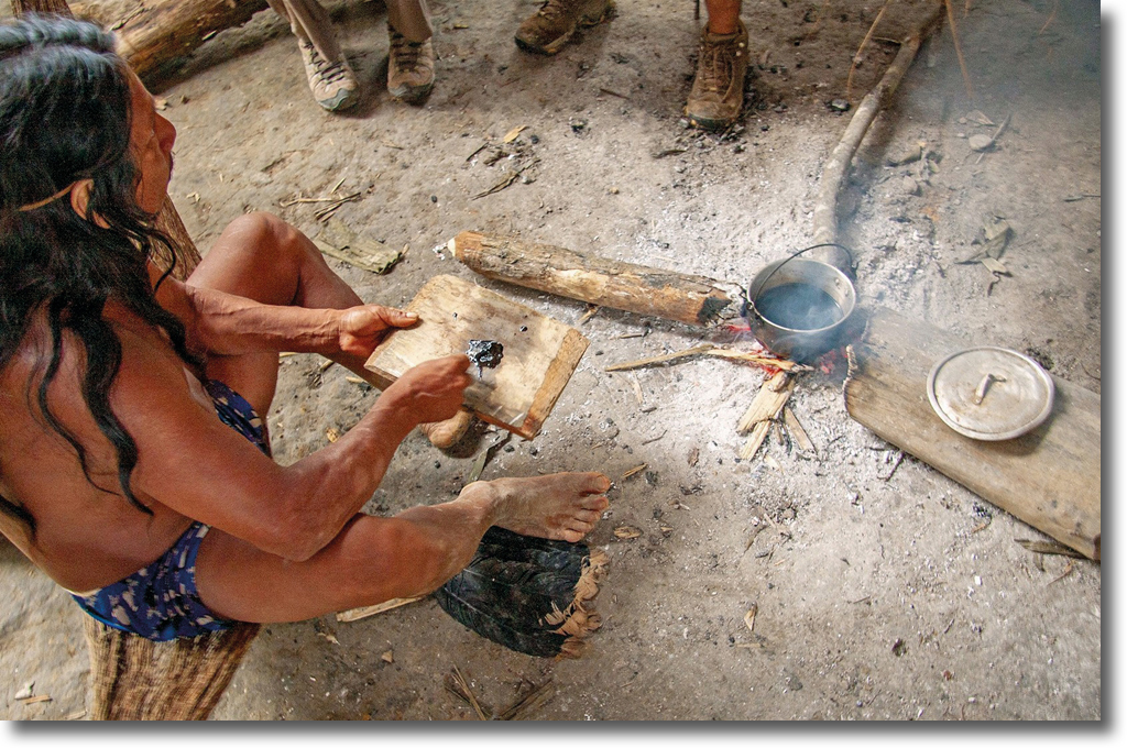 Они знаками показали нам двигаться за ними к строению, похожему на сарай. Там они развели костерок и из принесённой кожуры лиан выжали красновато-бурый сок. Затем поставили его томиться на огонь. После того, как жидкость закипела, на поверхности начала образовываться тонкая плёночка, которую старейшина аккуратно снимал, складывал рядом, а впоследствии смазывал ею приготовленные стрелы. Это и был яд кураре, капли которого достаточно, чтобы убить здоровенного быка.