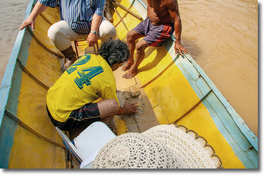 Как только мы находили их в темноте, рулевой направлял лодку в ту сторону. Задача индейца, находящегося на носу, состояла в том, чтобы прыгнуть на каймана сверху и зажать ему пасть. Оказывается, что кайманы могут с силой только захлопывать пасть, а на размыкание она слаба, достаточно замотать её скотчем, и кайман уже не опасен. Посмотрели на это жуткое зрелище, отпустили испуганного каймана и поплыли обратно.