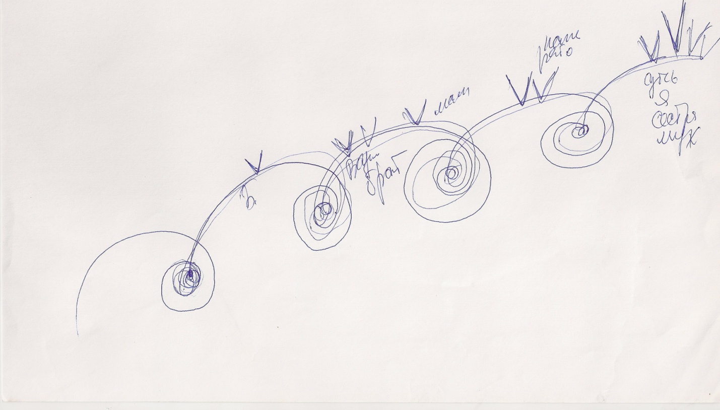 Анализ рисунка: Картина собственной жизни была нарисована всего за десять секунд. Рисунок носит схематический характер, на нём нет фигур и лиц. Нет контактов и отношений. В жизни Мисс нет самой Мисс. Есть движение и динамика вперёд и вверх. Жизнь закручивает Мисс, выжимает и, как она пояснила: «Это муха взбивает молоко». Она выпрыгивает наружу и закручивает такую же модель своей жизни. Ничего не меняется. Кто не помнит своих ошибок, обречён повторять их вновь. Сплошная текучка, только возрастает перспектива важности и роста. Но эта важность не вызывает хороших эмоций. Она даёт почувствовать, что Мисс ещё жива. Каждый новый уровень повторяет всё то, что было сделано ранее. Никакие вопросы не решаются, всё идёт как по накатанной. Нарастает напряжение, гайки закручиваются, и происходит взрыв. На рисунке нет радости, нет горя. На нём вообще нет признаков жизни. Спирали при оборотах уходят вниз – это волнительные падения эмоций и потребностей, которые задают темп жизни. Заставляются подниматься тогда, когда уже нет сил. Надо действовать. Относительно спокойная жизнь – это в перерывах круговорота жизненных схем, расстояние между спиралями. Всё ровно. Мисс использует свои возможности на пятьдесят процентов, так как не вся площадь листа занята жизнью Мисс. На мой вопрос: «Где находится Мисс на рисунке?» Мисс поставила галочку на самом верху при выходе из четвёртой спирали. Это значит, что весь этот путь пройден Мисс. Рядом с собой она расположила дочь, сестру и мужа сестры. В промежутке между третьей и четвёртой спиралью находятся папа и работа. В промежутке между второй и третьей спиралью находятся мама, Вадим и брат. Причём мама находится относительно брата и Вадима ближе к Мисс. В промежутке между первой и второй спиралью находится бабушка. Все люди находятся на расстоянии духовной значимости для Мисс.