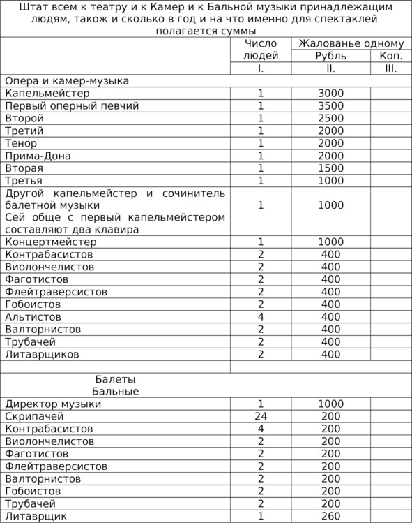 3. Из сей суммы имеют содержаны быть: 1) Певцы Итальянские для концертов при дворе Нашем и для большой оперы; 2) Театр Российский; 3) Опера Комическая Итальянская; 4) театр Французский; 5) театр Немецкий; 6) балеты; 7) оркестр, как для концертов при Дворе, так и для всех означенных зрелищ достаточный, и наконец 8) все вообще для того потребные люди и вещи.