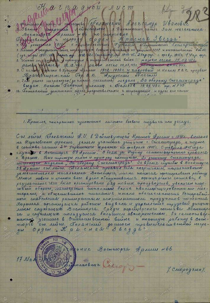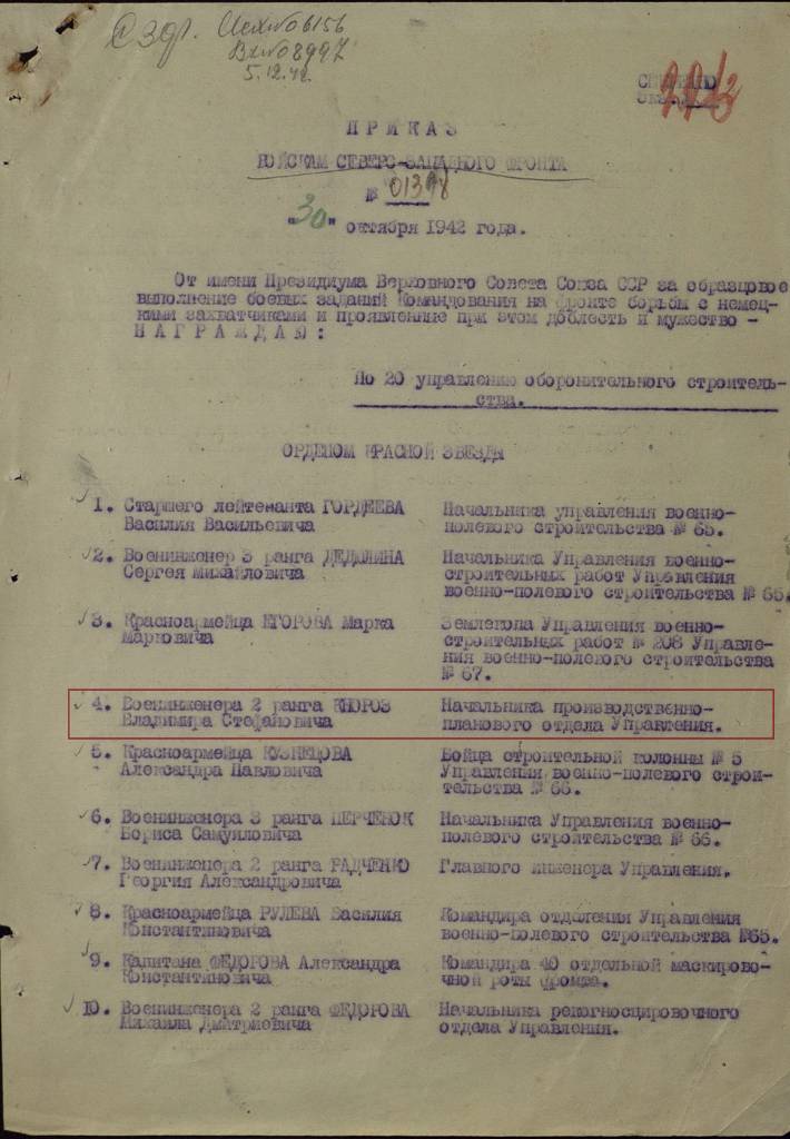 Мой же прадед с первых дней войны попадает в действующую армию. Там он руководит строительством оборонительных объектов, восстанавливает мосты, железные и шоссейные дороги. Был инженером 2 ранга. Приказом от 30 октября 1942 года, награжден орденом «Красной Звезды». Вот краткое изложение личного боевого подвига или заслуг из наградного листа.