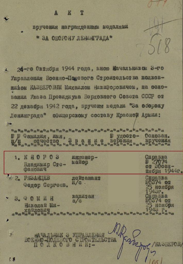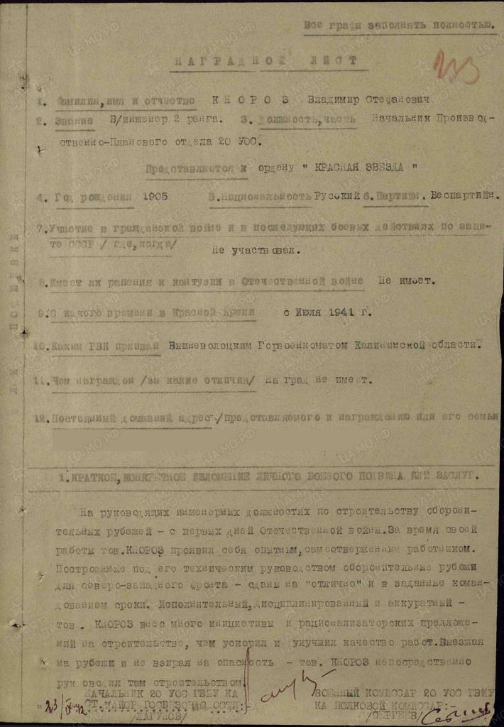 «На руководящих инженерных должностях по строительству оборонительных рубежей – с первых дней Отечественной войны. За время своей работы тов. КНОРОЗ проявил себя опытным, самоотверженным работником. Построенные под его техническим руководством оборонительные рубежи для северо-западного фронта сданы на «отлично» и в заданные командованием сроки. Исполнительный, дисциплинированный и аккуратный тов. Кнороз внес много инициативы и рационализаторских предложений на строительстве, чем ускорил и улучшил качество работ. Выезжая на рубежи и не взирая на опасность тов. Кнороз непосредственно руководил там строительством».