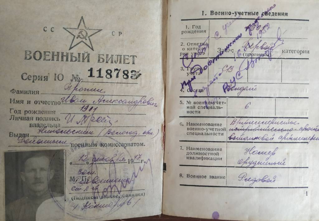 Мой прапрадедушка Тропин Иван Александрович 1901 года рождения, воевал с сентября 1941 года по июль 1945 года, был наводчиком зенитного пулемета Отдельной Истребительно- противотанковой дивизии 397, был дважды легко ранен, дошел до Берлина. Имеет награды медали: «За отвагу», «За победу над Германией», «За освобождение Варшавы», «За взятие Берлина».