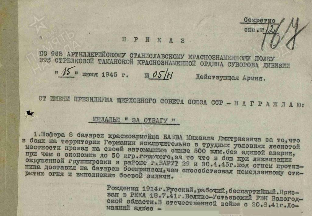 Баёв Михаил Дмитриевич, родился в 1914 году в деревне Осечкино Вологодской губернии, в многодетной семье. Детей было восемь человек. Они были середняки. После революции их семья была раскулачена, но их не сослали.