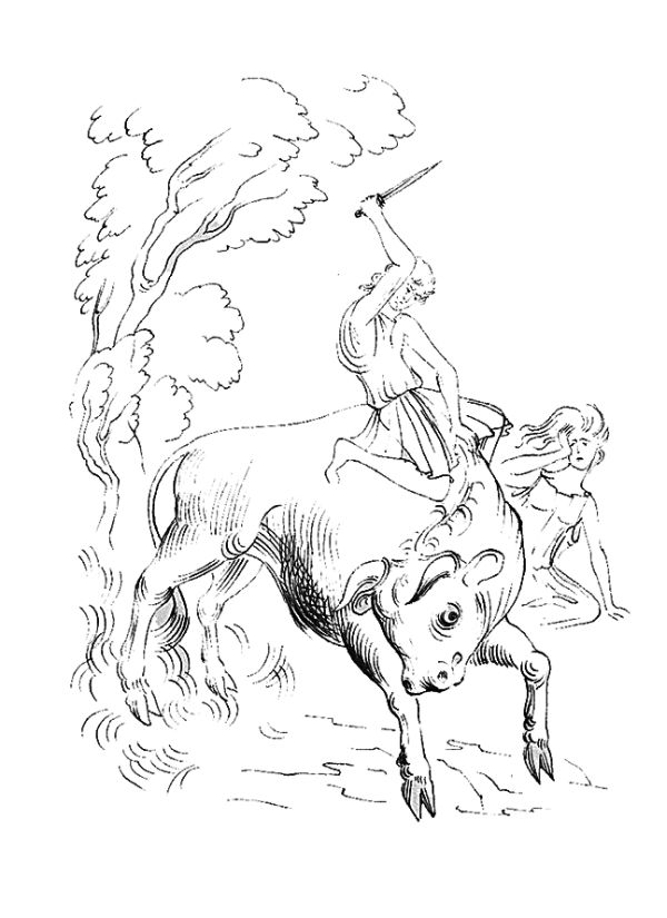 С трудом выйдя из воды, он встряхнулся, уперся рогами в землю и поднял целые тучи песку своими копытами. При виде чудовища, римлянка вскрикнула.