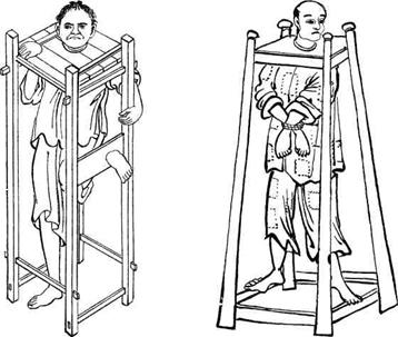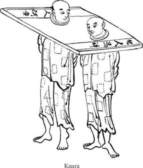 Канга, или деревянный ошейник (шейная колодка), – другой способ наказания за мелкие правонарушения. Канги бывают разными по весу, некоторые из них очень тяжелы. Преступников приговаривают к ношению ее на срок от двух недель до трех месяцев. На протяжении всего этого времени кангу не снимают с шеи узника ни днем ни ночью. Ее форма не позволяет человеку ни прислониться к стене, ни растянуться на земле во весь рост, и, судя по изможденной внешности узников подвергшихся этому наказанию, оно достаточно сурово. Имя узника и характер его преступления большими иероглифами написаны на канге в назидательных целях.