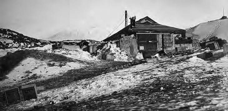 Собачьи конуры располагались вплотную к крыльцу, но в них мы держали постоянно на цепи лишь трех собак. Метеорологическая станция помещалась с наветренной стороны дома, наверху небольшого хребта, метров на шесть выше дома и в 12 метрах над уровнем моря. Туда вела естественная тропинка. Адамс устроил эту станцию и с 22 марта на ней начались регулярные метеорологические наблюдения. Фундаментом для метеорологической будки служил тяжелый деревянный ящик, поставленный на скалы и на три четверти наполненный камнями. Вокруг него навалили обломки кенита, а все промежутки между ними заполнили вулканической землей, которую облили водой. Конструкция получилась прочная, как камень. Внутрь ящика по обеим сторонам поставили и закрепили камнями и болтами два столба, к которым крепко привинтили болтами метеорологическую будку стандартного размера конструкции Стивенсона. Ввиду того что запись показаний инструментов приходилось делать через каждые два часа и днем и ночью, а в плохую погоду наблюдатель мог легко заблудиться и не найти дороги к будке, по пути туда поставили ряд столбов, укрепленных в почве льдом, и между ними протянули веревку, по которой можно было добраться до будки даже во время самой непроглядной метели.