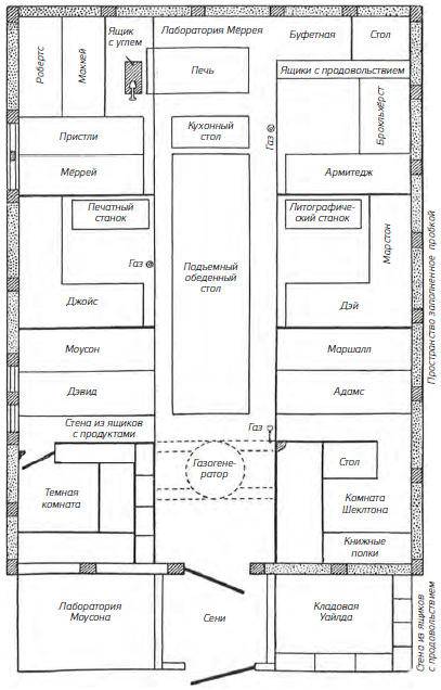 Следующую кабинку, по ту же сторону дома занимали Армитедж и Брокльхёрст. Здесь вся меблировка, шкафчики и полочки были весьма примитивны. Мне пришлось прожить в этом помещении два месяца на месте Брокльхёрста, в то время как его после операции уложили в моей комнате. Я соорудил там тогда постель на ящиках из-под керосина, и первое время их запах был не очень приятен, но мало-помалу он выдохся. Дальше за кабинкой Армитеджа и Брокльхёрста находилась буфетная, отгороженная рядом ящиков, образовавших настоящую стену между головами спящих и продовольствием. Буфетная, служившая также пекарней и кладовой, была не слишком обширна – всего 1,8 метра в длину и 0,9 метра в ширину, но нас она вполне удовлетворяла. Второй стеной буфетной служила стена дома, сплошь до начала ската крыши заполненная полками, продолжавшимися и в средней части помещения за печью. Печь помещалась отступя от стены на 120 см. В этом пространстве была отгорожена досками, обитыми парусиной, наша биологическая лаборатория, занимавшая 121×121 см. Недостаток места восполнялся множеством полок по ее стенам, содержавших бесчисленное количество баночек, вскоре наполнившихся биологическими трофеями Мёррея.