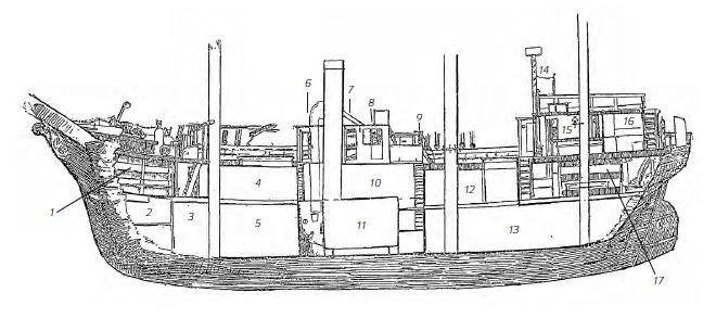 1 – бак, 2 – склад, 3 – цепной ящик, 4 – передний трюм, 5 – нижний трюм, 6 – кочегарка, 7 – судовой плотник, 8 – камбуз, 9 – машинное отделение, 10 – машинное отделение, 11 – котел, 12 – задний трюм, 13 – нижний трюм, 14 – задний мостик, 15 – офицерские каюты, 16 – каюта капитана, 17 – «устричный закоулок»