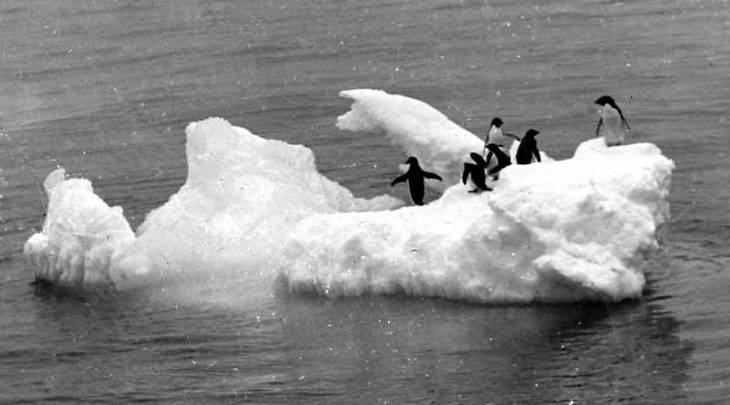 Под вечер начали попадаться небольшие плавучие айсберги и крупные льдины. Из-за непогоды мы не могли далеко видеть вперед и потому направили судно еще западнее, чтобы обогнуть эти массы льда. Один айсберг, очевидно, опрокинулся и, судя по всему, сидел на мели. В большом количестве стали попадаться пингвины Адели. Встретился и какой-то тюлень, но из-за дальности расстояния вид нельзя было определить.