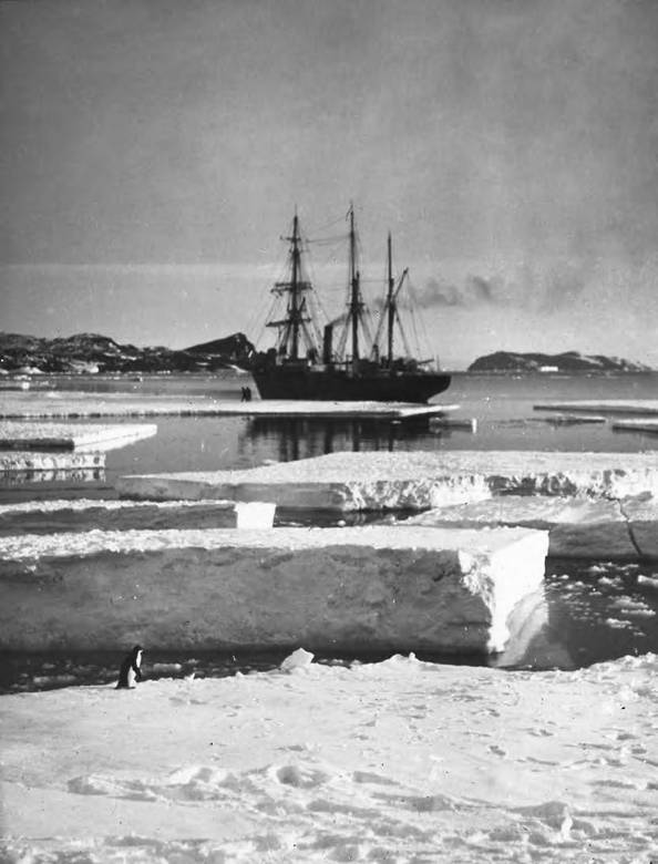 Около 20 часов я вместе с Адамсом и Уайлдом отправился на вельботе к берегу, захватив с собой ручной лот. Мы прошли на веслах всего минут десять, делая частые остановки для промеров, и уперлись в сплошной лед. Он покрывал весь залив от мыса Флагштока, как мы назвали после утес на южной оконечности мыса Ройдс, по направлению к югу вплоть до мыса Барни. Недалеко от этого мыса лед был разломан и образовал нечто вроде естественного дока. Мы завели туда лодку, перебрались с Адамсом через четко обозначенную приливную трещину, вскарабкались на берег и поднялись на голую скалистую вершину по покрытому ровным снегом склону шириной примерно в 15 метров. Сотни пингвинов собрались на льду залива. Еще больше их было наверху склона. Так что, когда мы поднялись наверх, нам пришлось зажимать носы от нестерпимой вони их гнездовья. Птицы эти сновали по всем направлениям и приветствовали нас хриплыми взволнованными криками. Над пингвинами летали во множестве их естественные враги, хищные большие поморники, у которых, очевидно, были птенцы, потому что, когда мы, подымаясь по склону, приблизились к их гнездам, они стали бросаться прямо на нас, пролетая над самыми головами. Резкий шелест их быстрых крыльев явно говорил о том, как они возмущены нашим вторжением.