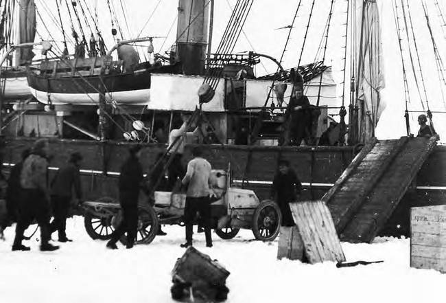 За этот день мы выгрузили прежде всего запас корма для лошадей, достаточное количество керосина и провизии для береговой партии на случай, если судно вынуждено будет из-за плохой погоды уйти в море. Для облегчения выгрузки мы разделились на две группы. Часть судовой команды доставала грузы из трюмов и спускала ящики, тюки и мешки на лед по широкой наклонной доске. Другая часть команды грузила все это на сани, которые переправляли на берег члены берегового отряда, впрягаясь по три человека в сани.