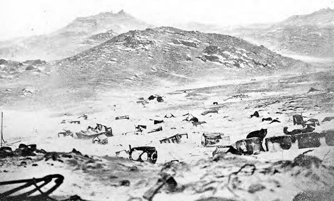 Вверху: начало высадки на мысе Деррик. Внизу: разбросанное после метели снаряжение