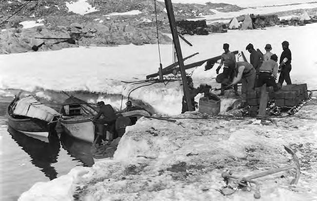 Работа была настолько тяжелой, что мы попытались заменить ручную доставку механической. С этой целью на снежном склоне как раз над трещиной укрепили на якоре блок. Все бывшие в ходу и запасные бухты каната, имевшиеся на судне, срастили в один длинный канат, пропустили его через блок и провели обратно на судно. Один конец каната был накручен на барабан паровой лебедки. К другому концу привязывались сани и через блок втаскивались на берег лебедкой. Теоретически это было неплохое приспособление, но на практике мы убедились, что доставка этим способом занимает намного больше времени, в особенности из-за того, что конец каната каждый раз приходилось обратно тащить на судно. Поэтому пришлось возвратиться к первоначальному способу доставки вручную. Около полудня нам удалось продвинуть судно вдоль кромки льда метров на сто ближе к берегу, так как утром часть льда обломалась и уплыла, оставив пространство, в котором судно удобно устроилось.