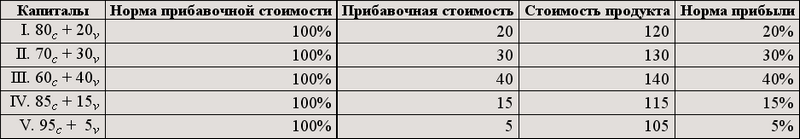 Пусть на капиталистическом предприятии в сфере производства A на каждые 700 единиц всего капитала расходуется только 100 единиц на переменный и 600 на постоянный капитал, тогда как в сфере производства B – 600 на переменный и 100 на постоянный капитал. Тогда весь капитал A в 700 будет приводить в движение рабочую силу, равную всего 100, что, при прежнем нашем предположении даёт лишь 100 рабочих недель, или 6 000 часов живого труда; между тем равновеликий совокупный капитал B приводит в движение труд в 600 недель, и, следовательно, 36 000 часов живого труда. Поэтому капитал в сфере A мог бы присвоить только 50 рабочих недель, или 3 000 часов прибавочного труда, тогда как равновеликий капитал в сфере B – 300 рабочих недель, или 18 000 часов. Переменный капитал есть показатель не только труда, заключающегося в нём самом, но при данной норме прибавочной стоимости вместе с тем и показатель приводимого им в движение труда сверх этой меры, избыточного или прибавочного труда. При одинаковой степени эксплуатации труда прибыль в первом случае была бы = 100/700= 1/7 = 142/7%, а во втором = 600/700= 855/7%, т. е. в шесть раз бо́льшая норма прибыли. Но в действительности в этом случае сама прибыль была бы в шесть раз больше, 600 для B против 100 для A, так как в шесть раз больше живого труда приводится в движение таким же самым капиталом, следовательно, при равной степени эксплуатации труда, производится в шесть раз больше прибавочной стоимости, а значит и в шесть раз больше прибыли.
