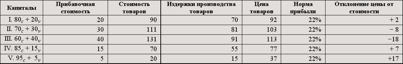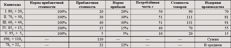 Пусть среднее строение общественного капитала 80c + 20v и норма годовой прибавочной стоимости m' = 100 %, тогда средняя годовая прибыль для капитала в 100 будет = 20 и общая годовая норма прибыли = 20 %. Каковы бы ни были k, издержки производства товаров, произведённых в течение года капиталом 100, их цена производства была бы во всяком случае = k + 20. В сферах производства, где строение капитала = (80 − x)c + (20 + x)v, действительно произведённая прибавочная стоимость или прибыль, произведённая в течение года в данной сфере производства, была бы = 20 + x, т. е. больше, чем 20, и произведённая товарная стоимость была бы = k + 20 + x, больше, чем k + 20, или больше, чем цена производства. В сферах, где строение капитала = (80 + x)c + (20 − x)v, произведённая в течение года прибавочная стоимость, или прибыль, была бы = 20 − x, т. е. меньше, чем 20, и потому стоимость товара k + 20 – x была бы меньше, чем цена производства, которая = k + 20. Если оставить в стороне возможные различия во времени оборота, цена производства товаров была бы равна их стоимости только в тех сферах, где строение капитала случайно = 80c + 20v.