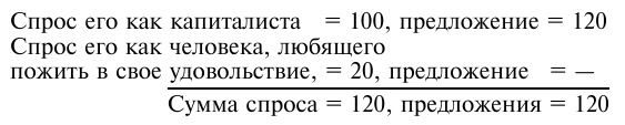 Перейдём теперь к воспроизводству. Предположим, что капиталист лично потребляет всю прибавочную стоимость д и превращает снова в производительный капитал только сумму, равную величине первоначального капитала K. В таком случае спрос капиталиста по стоимости равен его предложению. Но не равен в связи с движением его капитала; как капиталист он предъявляет спрос только на 4/5 своего предложения (по величине стоимости); 1/5 он потребляет как некапиталист, не в силу своих функций капиталиста, а на свои личные потребности или удовольствия.